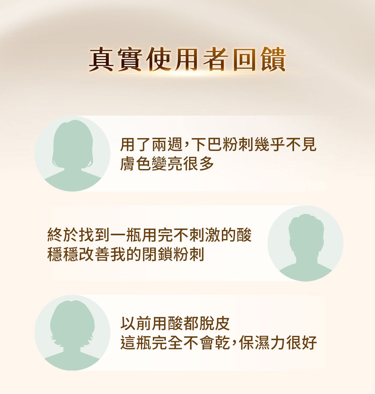 杏仁酸原液配方不添加任何醇類,大大降低致痘發炎的問題!