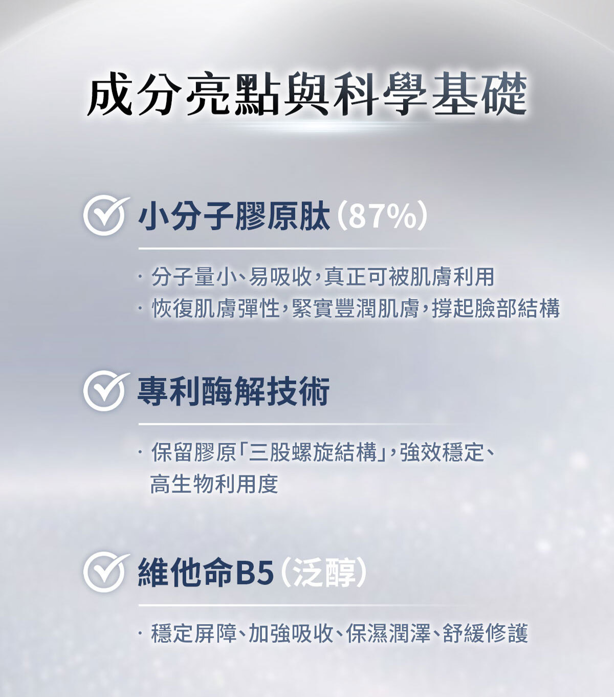 原料來源採用加拿大🇨🇦冰魚 透過專利酶解技術從魚麟萃取 因為特殊的萃取技術 使得蛋白質仍保有三股螺旋結構,更具保養效益。